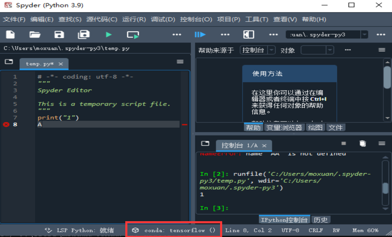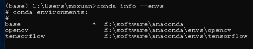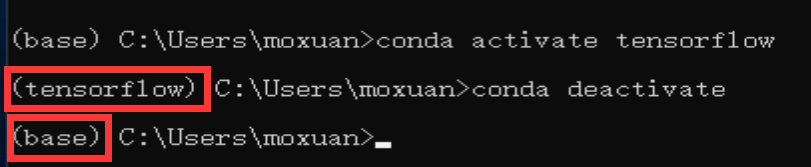 可以看到,当你激活环境之后,左侧的环境显示tensorflow环境,当你取消激活之后,左侧显示base默认环境。
