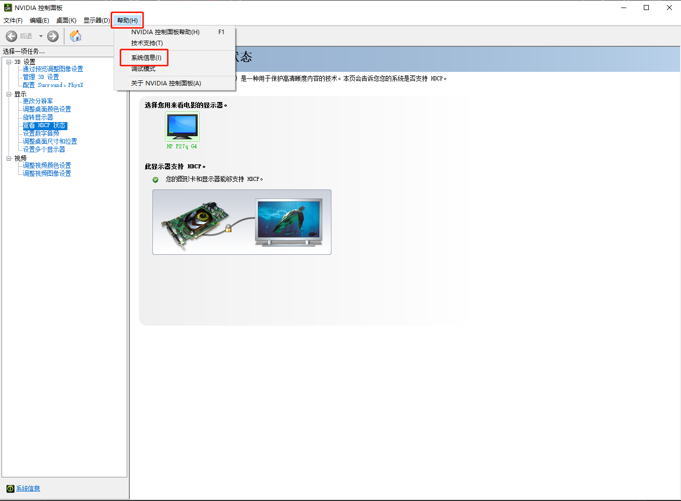桌面点击右键,打开NVIDIA控制面板,选择帮助-系统信息