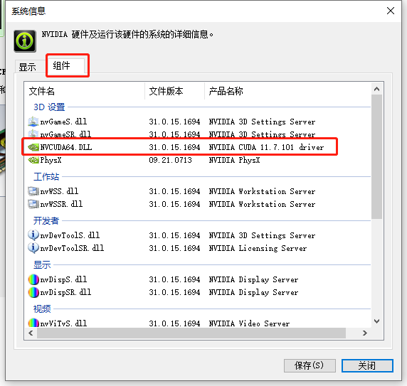 在打开的系统信息界面选择组件,查看CUDA版本,这里是11.7.101