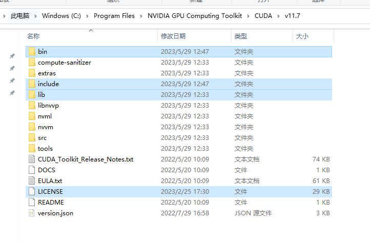 如果安装CUDA的时候没有更改目录,CUDA默认安装在:C:\Program Files\NVIDIA GPU Computing Toolkit\CUDA\v11.7