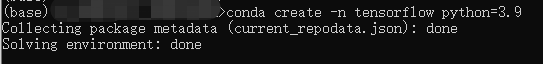 打开conda命令行窗口,输入conda create -n tensorflow python=3.9(创建一个名为tensorflow的虚拟环境,python版本为3.9)