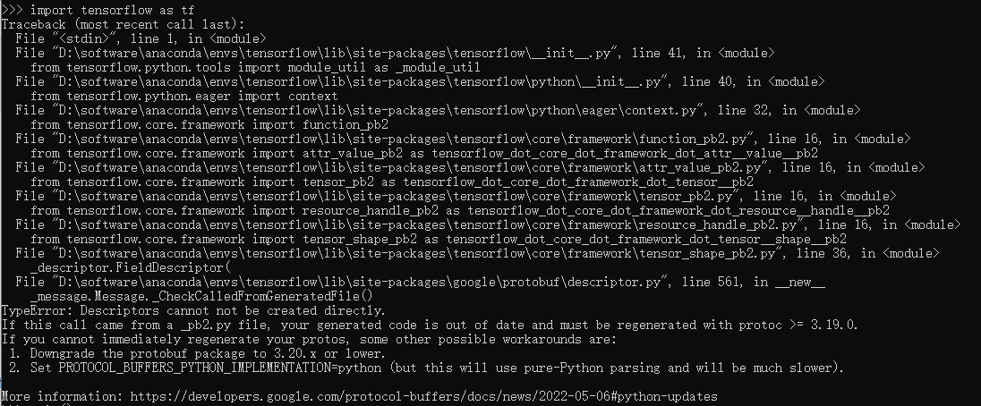 安装完之后,我们进入python环境,输入import tensorflow as tf