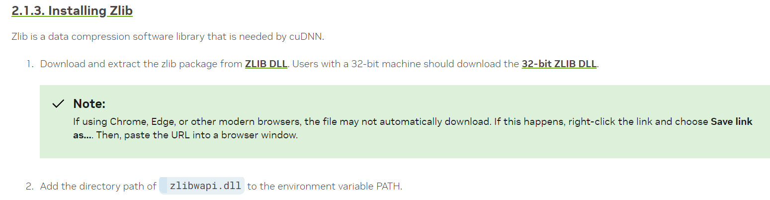 3. Could not zlibwapi.dll. Please make sure it is in your library path,去英伟达官网下载zlibwapi.dll文件:https://docs.nvidia.com/deeplearning/cudnn/install-guide/index.html#install-zlib-windows