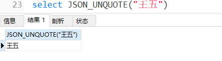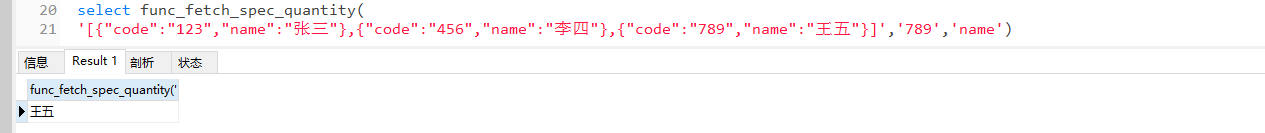 select JSON_EXTRACT('[{"code":"123","name":"张三"},{"code":"456","name":"李四"},{"code":"789","name":"王五"}]', '$[2].name')