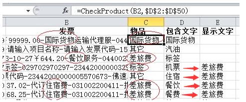 (比如,若B列文字中出现了【汽油】C列就直接显示【汽油】,若B列文字包含了【住宿】C列就显示【差旅费】)