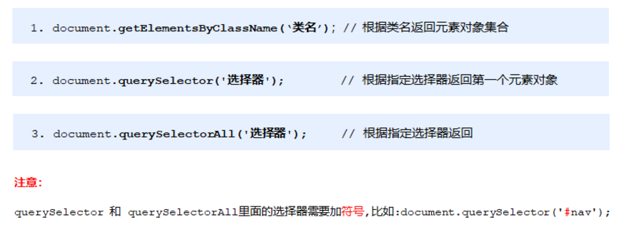 // 2. querySelector 返回指定选择器的第一个元素对象 切记 里面的选择器需要加符号 .box #nav