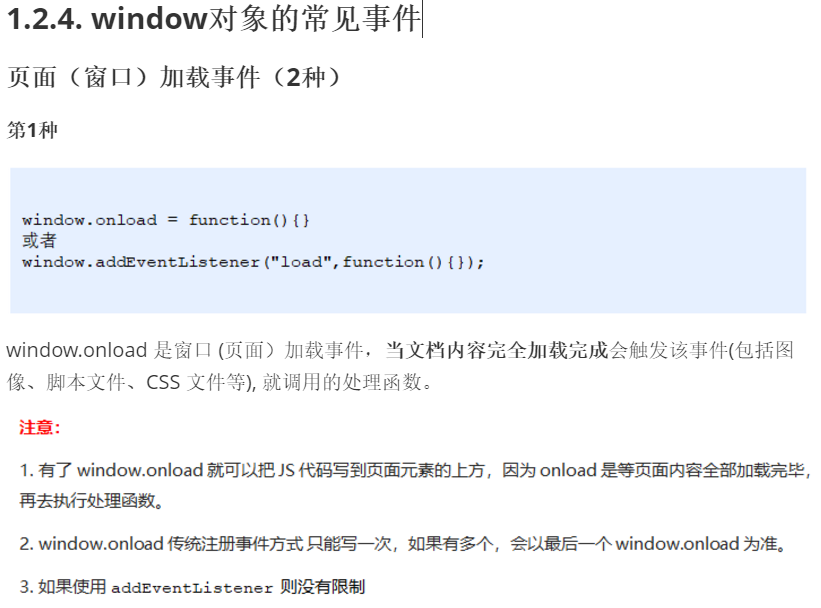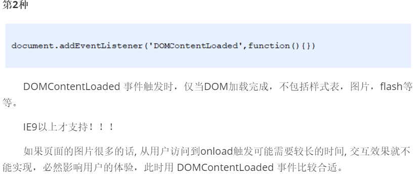 <script> window.addEventListener('load', function() { var btn = document.querySelector('button'); btn.addEventListener('click', function() { alert('点击我'); }) }) window.addEventListener('load', function() { alert(22); }) document.addEventListener('DOMContentLoaded', function() { alert(33); }) </script>