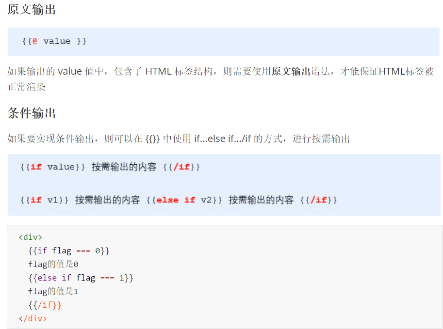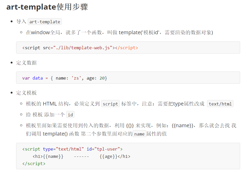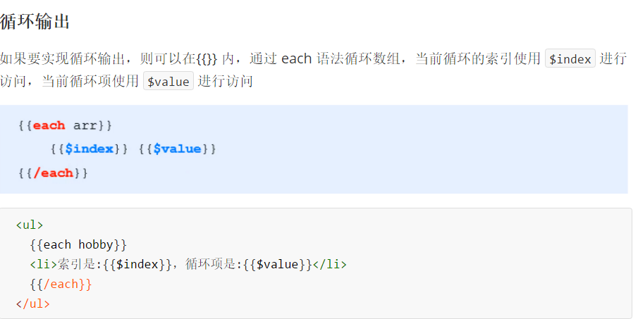 art-template 提供了 {{}} 这种语法格式,在 {{}} 内可以进行 变量输出 或 循环数组 等操作,这种 {{}} 语法在 art-template 中被称为标准语法