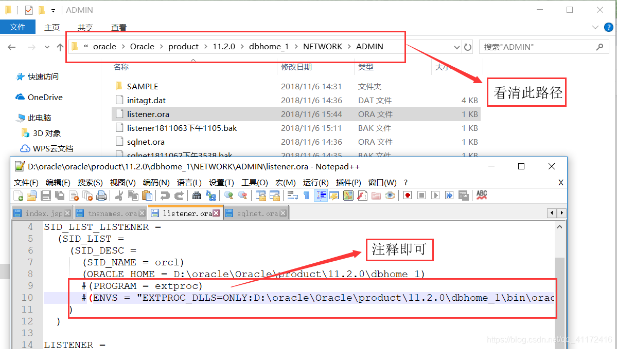 打开【listener.ora】文件,注释PROGRAM和ENVS,重启监听或者重启Windows