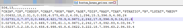 波士顿房价数据集(Boston)位于../Python37/Lib/site-packages/sklearn/datasets/data/boston_house_prices.csv文件,共计506条数据。