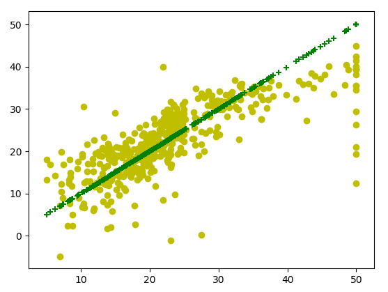#画图 import matplotlib.pyplot as plt plt.scatter(boston.target, predicted, color="y", marker="o") plt.scatter(boston.target, boston.target, color="g", marker="+") plt.show()