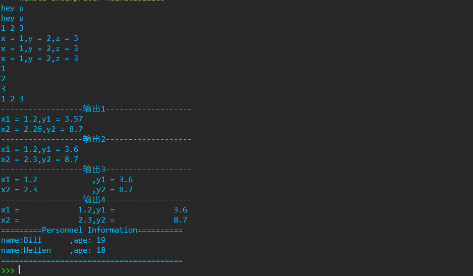 #print输出的几种用法 #task1_1 print('hey u') print('hey','u') x,y,z = 1,2,3 print(x,y,z) print('x = %d,y = %d,z = %d' %(x,y,z)) print('x = {},y = {},z = {}'.format(x,y,z)) print(f'x = {x},y = {y},z = {z}') print(x) print(y) print(z) print(x,end=' ') print(y,end=' ') print(z) #task1_2 x1,y1 = 1.2,3.57 x2,y2 = 2.26,8.7 print('{:-^40}'.format('输出1')) print('x1 = {},y1 = {}'.format(x1,y1)) print('x2 = {},y2 = {}'.format(x2,y2)) print('{:-^40}'.format('输出2')) print('x1 = {:.1f},y1 = {:.1f}'.format(x1,y1)) print('x2 = {:.1f},y2 = {:.1f}'.format(x2,y2)) print('{:-^40}'.format('输出3')) print('x1 = {:<15.1f},y1 = {:<15.1f}'.format(x1,y1)) print('x2 = {:<15.1f},y2 = {:<15.1f}'.format(x2,y2)) print('{:-^40}'.format('输出4')) print('x1 = {:>15.1f},y1 = {:>15.1f}'.format(x1,y1)) print('x2 = {:>15.1f},y2 = {:>15.1f}'.format(x2,y2)) #task1_3 name1,age1 = 'Bill',19 name2,age2 = 'Hellen',18 title = 'Personnel Information' print(f'{title:=^40}') print(f'name:{name1:10},age:{age1:3}') print(f'name:{name2:10},age:{age2:3}') print(40*'=')