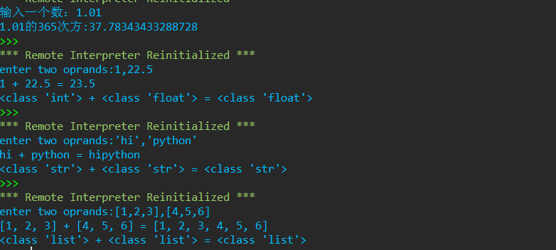 #task2_1 r1 = eval('1 + 2') print(type(r1),r1) r2 = eval('[1,6,7.5]') print(type(r2),r2) r3 = eval('"python"') print(type(r3),r3) r4 = eval('7,42') print(type(r4),r4) #task2_2 x,y = eval(input('enter two oprands:')) ans = x + y print(f'{x} + {y} = {ans}') print(f'{type(x)} + {type(y)} = {type(ans)}')