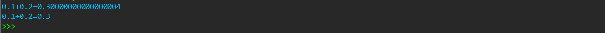#task3 ans1 = 0.1+0.2 print(f'0.1+0.2={ans1}') from decimal import Decimal ans2 = Decimal('0.1')+Decimal('0.2') print(f'0.1+0.2={ans2}')