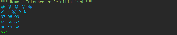 #task4 print(chr(0x1f600),end=" ") print(chr(0x1f601),end=" ") print(chr(0x1f602),end=" ") print(chr(0x1f603),end=" ") print(chr(0x1f604)) print(chr(10000),end=" ") print(chr(0x025b),end=" ") print(chr(0x2708),end=" ") print(chr(0x00A5),end=" ") print(chr(0x266b)) print(ord('a'),end=" ") print(ord('b'),end=" ") print(ord('c')) print(ord('A'),end=" ") print(ord('B'),end=" ") print(ord('C')) print(ord('0'),end=" ") print(ord('1'),end=" ") print(ord('2'))