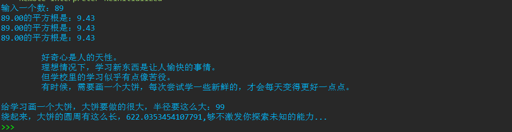 #task5_1 from math import sqrt n = float(input('输入一个数:')) ans1 = sqrt(n) ans2 = n**0.5 print('%.2f的平方根是:%.2f' %(n,ans1)) print('{:.2f}的平方根是:{:.2f}'.format(n,ans2)) print(f'{n:.2f}的平方根是:{ans2:.2f}') #task5_2 from math import pi text = ''' 好奇心是人的天性。 理想情况下,学习新东西是让人愉快的事情。 但学校里的学习似乎有点像苦役。 有时候,需要画一个大饼,每次尝试学一些新鲜的,才会每天变得更好一点点。 ''' print(text) r = float(input('给学习画一个大饼,大饼要做的很大,半径要这么大:')) circle = 2*pi*r print(f'绕起来,大饼的圆周有这么长,{circle},够不激发你探索未知的能力...')