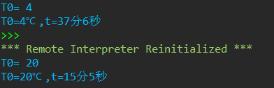 T0=eval(input('T0= ')) from math import log from math import pi t=((67**(2/3)*3.7*1.038**(1/3)))/((5.4*0.001)*pi**(2)*(4*pi/3)**(2/3))*log(0.76*(T0-100)/(70-100)) x=t%60 y=t//60 print('T0={}℃'',''t={:.0f}分{:.0f}秒'.format(T0,x,y))