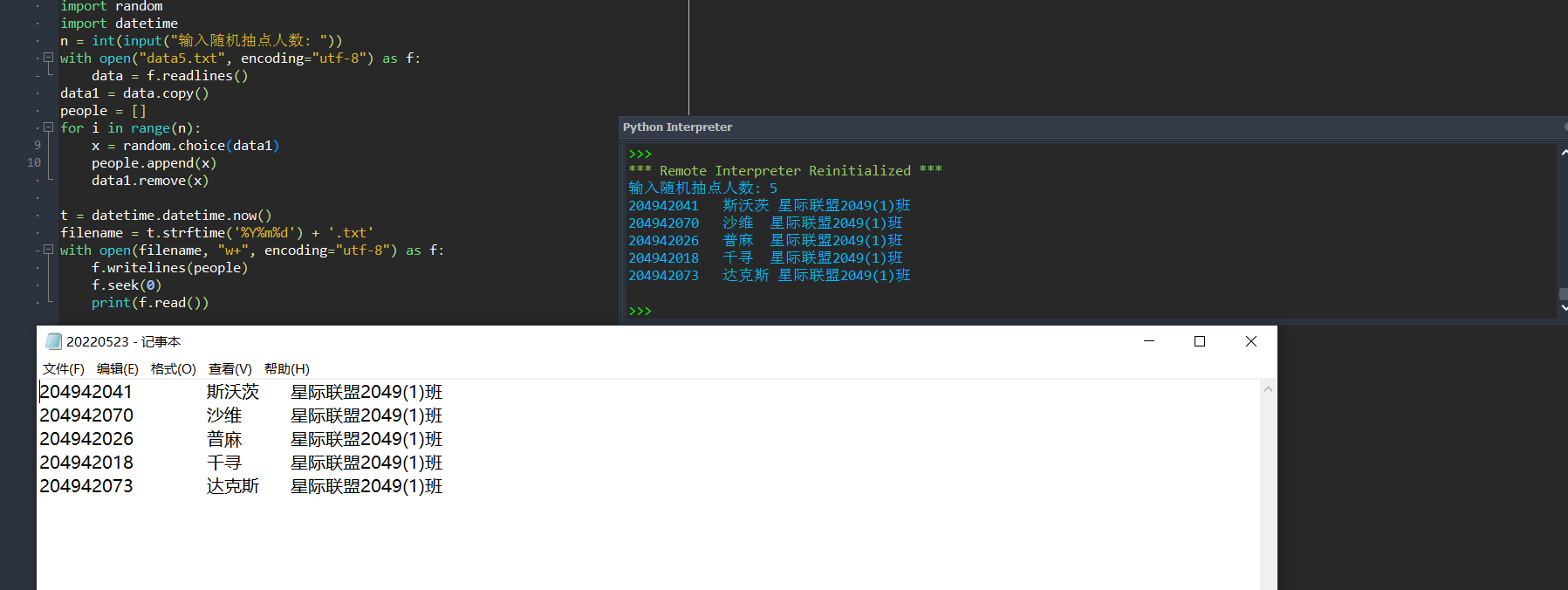 import random import datetime n = int(input("输入随机抽点人数: ")) with open("data5.txt", encoding="utf-8") as f: data = f.readlines() data1 = data.copy() people = [] for i in range(n): x = random.choice(data1) people.append(x) data1.remove(x) t = datetime.datetime.now() filename = t.strftime('%Y%m%d') + '.txt' with open(filename, "w+", encoding="utf-8") as f: f.writelines(people) f.seek(0) print(f.read())