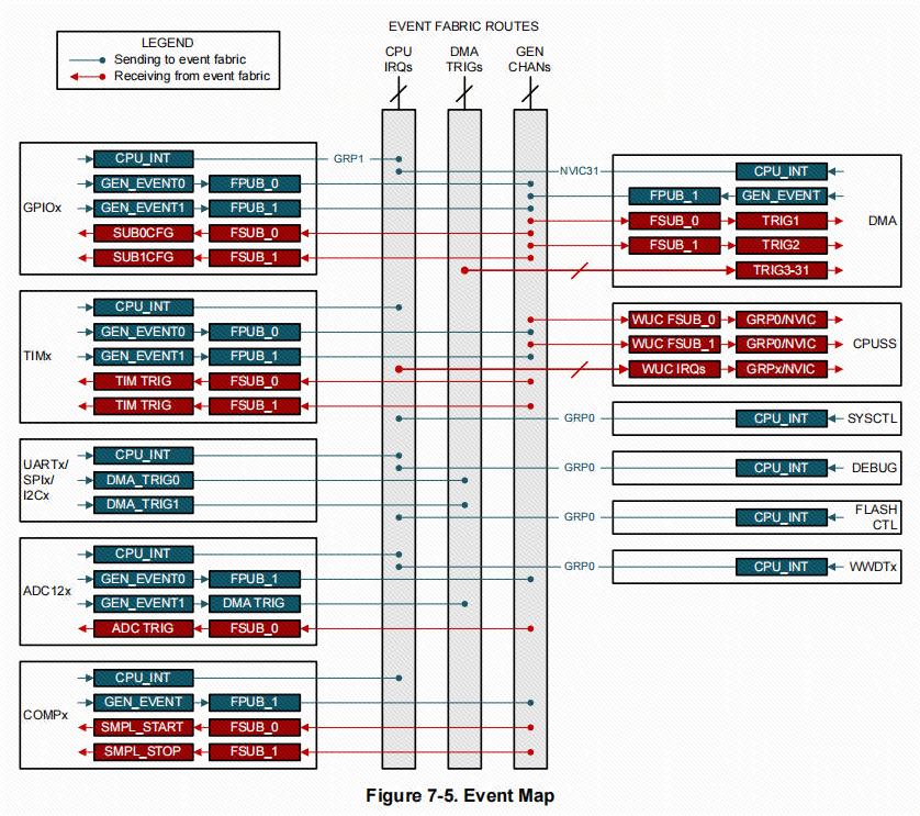 下图为MSPM0系列的事件安排表。其中绿色表示事件发布者(发送),将外设上发生的事件告诉总线;红色为事件订阅者(接收),接收总线上的事件情况。
