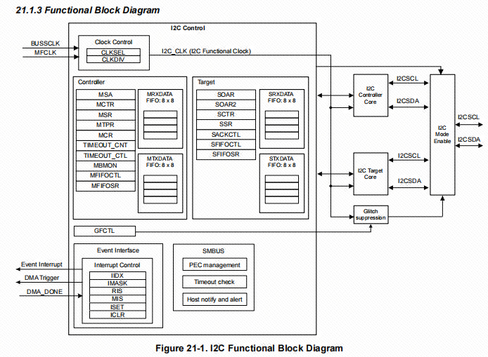 MSPM0G系列的I2C支持主从模式,有7位地址位可以设置,支持 100kbps、400kbps、1Mbps 的 I2C 标准传输速率,并支持 SMBUS。 无论是主机或者从机,发送和接收都有独立的8个字节FIFO。MSPM0 I2C 具有 8 字节 FIFO,对于控制器和目标模式会生成独立的中断,并支持 DMA。