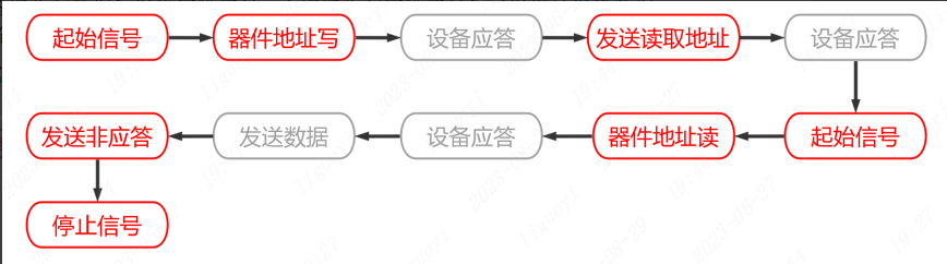 - 设备接收到地址后发送应答信号,主控接收到应答信号后发送数据或继续发送地址。