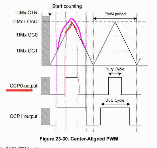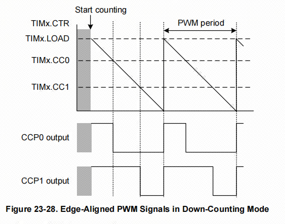PWM一共有两种模式,一个是边缘对齐PWM,指的是定时器使用的向下计数模式,输出通道在定时器计数开始的时候会输出高电平,当计数值与输出通道的比较值(图中的CC0和CCP0,CC1和CCP1)相同的时候,输出通道会输出低电平,一直到定时器的计数值计数到0,就完成了一个周期的脉冲输出。