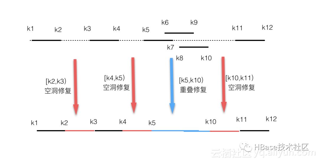 如果有region空洞的时候,就会使用他们的空洞边界作为startkey/endkey,再修复创建一个region目录及目录下的regioninfo文件。如果是region重叠,则会把重叠的region进行合并,取所有region的最大最小rowkey作为merge后新region的最大最小rowkey。