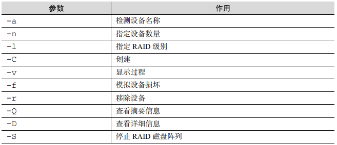 1 其中,-C 参数代表创建一个 RAID 阵列卡;-v 2 参数显示创建的过程,同时在后面追加一个设备名称/dev/md0,这样/dev/md0 就是创建后的 3 RAID 磁盘阵列的名称;-n 4 参数代表使用 4 块硬盘来部署这个 RAID 磁盘阵列;而-l 10 参数 4 则代表 RAID 10 方案;最后再加上 4 块硬盘设备的名称就搞定了。 5 [root@linuxprobe~]# mdadm -Cv /dev/md0 -n 4 -l 10 /dev/sdb /dev/sdc /dev/sdd /dev/sde 6 mdadm: layout defaults to n2 7 mdadm: layout defaults to n2 8 mdadm: chunk size defaults to 512K 9 mdadm: size set to 20954112K 10 mdadm: Defaulting to version 1.2 metadata 11 mdadm: array /dev/md0 started.