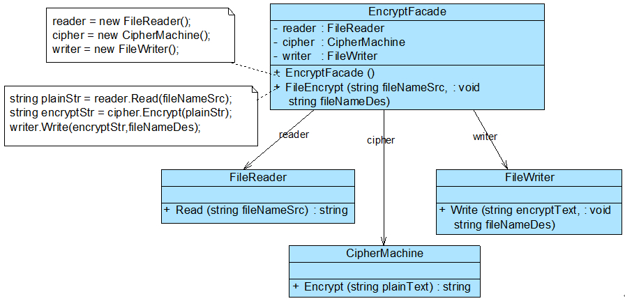 public class FileReader { public String read(String path){ FileInputStream fis=null; try { fis=new FileInputStream(path); byte[]b=new byte[1024]; int len=0; StringBuffer sb=new StringBuffer(); while((len=fis.read(b))!=-1){ sb.append(new String(b,0,len)); } return sb.toString(); }catch (FileNotFoundException e){ e.printStackTrace(); }catch (IOException e){ e.printStackTrace(); }finally { try { fis.close(); }catch (IOException e){ e.printStackTrace(); } } return ""; } } public class FileWriter { public void write(String content,String path){ FileOutputStream fos=null; try { fos=new FileOutputStream(path); fos.write(content.getBytes()); }catch (FileNotFoundException e){ e.printStackTrace(); }catch (IOException e){ e.printStackTrace(); } finally { try { fos.close(); }catch (IOException e){ e.printStackTrace(); } } } } public class CipherMachine { public String Encrypt(String str){ char[]arr=str.toCharArray(); StringBuffer sb=new StringBuffer(); for (char c: arr) { sb.append(c+1); } return sb.toString(); } } public class EncryptFacade { private FileReader fileReader; private CipherMachine cipherMachine; private FileWriter fileWriter; public EncryptFacade(){ fileReader=new FileReader(); cipherMachine=new CipherMachine(); fileWriter=new FileWriter(); } public void FileEncrypt(String source,String target){ String str=fileReader.read(source); String enStr=cipherMachine.Encrypt(str); fileWriter.write(enStr,target); } } public class Main { public static void main(String[] args) { EncryptFacade encryptFacade=new EncryptFacade(); encryptFacade.FileEncrypt("D:\\facade\\source.txt","D:\\facade\\target.txt"); } }