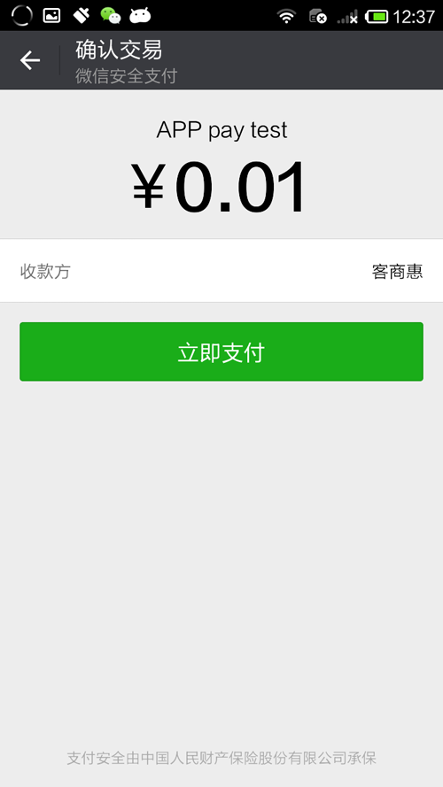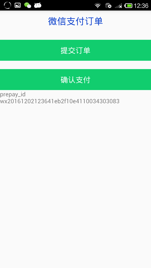 package com.alpha.live;import java.io.StringReader;import java.util.HashMap;import java.util.LinkedList;import java.util.List;import java.util.Map;import java.util.Random;import org.apache.http.NameValuePair;import org.apache.http.message.BasicNameValuePair;import org.xmlpull.v1.XmlPullParser;import com.tencent.mm.sdk.modelpay.PayReq;import com.tencent.mm.sdk.openapi.IWXAPI;import com.tencent.mm.sdk.openapi.WXAPIFactory;import android.app.Activity;import android.app.AlertDialog;import android.app.ProgressDialog;import android.os.AsyncTask;import android.os.Bundle;import android.util.Log;import android.util.Xml;import android.view.View;import android.view.View.OnClickListener;import android.widget.Button;import android.widget.TextView;import android.widget.Toast;/** * Created by Simon on 2016/12/2. */public class MainActivity extends Activity implements OnClickListener { private Button submitButton; private Button confirmButton; private TextView textView; private StringBuffer sb; private Map<String,String> resultunifiedorder; private PayReq req; private final IWXAPI msgApi = WXAPIFactory.createWXAPI(this, null); @Override protected void onCreate(Bundle savedInstanceState) { super.onCreate(savedInstanceState); setContentView(R.layout.activity_main); submitButton=(Button) findViewById(R.id.bt_submit_order); confirmButton=(Button) findViewById(R.id.bt_corfirm); textView=(TextView) findViewById(R.id.tv_prepay_id); submitButton.setOnClickListener(this); confirmButton.setOnClickListener(this); sb=new StringBuffer(); req=new PayReq(); } @Override public void onClick(View v) { // TODO Auto-generated method stub switch (v.getId()) { case R.id.bt_submit_order: PrePayIdAsyncTask prePayIdAsyncTask=new PrePayIdAsyncTask(); prePayIdAsyncTask.execute(urlString); //生成prepayId break; case R.id.bt_corfirm: genPayReq();//生成签名参数 sendPayReq();//调起支付 break; default: break; } } /* * 调起微信支付 */ private void sendPayReq() { msgApi.registerApp(Constants.APP_ID); msgApi.sendReq(req); Log.i(">>>>>", req.partnerId); } private long genTimeStamp() { return System.currentTimeMillis() / 1000; } private void genPayReq() { req.appId = Constants.APP_ID; req.partnerId = Constants.MCH_ID; if (resultunifiedorder!=null) { req.prepayId = resultunifiedorder.get("prepay_id"); req.packageValue = "prepay_id="+resultunifiedorder.get("prepay_id"); } else { Toast.makeText(MainActivity.this, "prepayid为空", Toast.LENGTH_SHORT).show(); } req.nonceStr = getNonceStr(); req.timeStamp = String.valueOf(genTimeStamp()); List<NameValuePair> signParams = new LinkedList<NameValuePair>(); signParams.add(new BasicNameValuePair("appid", req.appId)); signParams.add(new BasicNameValuePair("noncestr", req.nonceStr)); signParams.add(new BasicNameValuePair("package", req.packageValue)); signParams.add(new BasicNameValuePair("partnerid", req.partnerId)); signParams.add(new BasicNameValuePair("prepayid", req.prepayId)); signParams.add(new BasicNameValuePair("timestamp", req.timeStamp)); req.sign = genAppSign(signParams); sb.append("sign\n"+req.sign+"\n\n"); textView.setText(sb.toString()); Log.e("Simon", "----"+signParams.toString()); } private String genAppSign(List<NameValuePair> params) { StringBuilder sb = new StringBuilder(); for (int i = 0; i < params.size(); i++) { sb.append(params.get(i).getName()); sb.append('='); sb.append(params.get(i).getValue()); sb.append('&'); } sb.append("key="); sb.append(Constants.API_KEY); this.sb.append("sign str\n"+sb.toString()+"\n\n"); String appSign = MD5.getMessageDigest(sb.toString().getBytes()); Log.e("Simon","----"+appSign); return appSign; } private class PrePayIdAsyncTask extends AsyncTask<String,Void, Map<String, String>> { private ProgressDialog dialog; @Override protected void onPreExecute() { // TODO Auto-generated method stub super.onPreExecute(); dialog = ProgressDialog.show(MainActivity.this, "提示", "正在提交订单"); } @Override protected Map<String, String> doInBackground(String... params) { // TODO Auto-generated method stub String url=String.format(params[0]); String entity=getProductArgs(); Log.e("Simon",">>>>"+entity); byte[] buf=Util.httpPost(url, entity); String content = new String(buf); Log.e("orion", "----"+content); Map<String,String> xml=decodeXml(content); return xml; } @Override protected void onPostExecute(Map<String, String> result) { // TODO Auto-generated method stub super.onPostExecute(result); if (dialog != null) { dialog.dismiss(); } sb.append("prepay_id\n"+result.get("prepay_id")+"\n\n"); textView.setText(sb.toString()); resultunifiedorder=result; } } public Map<String,String> decodeXml(String content) { try { Map<String, String> xml = new HashMap<String, String>(); XmlPullParser parser = Xml.newPullParser(); parser.setInput(new StringReader(content)); int event = parser.getEventType(); while (event != XmlPullParser.END_DOCUMENT) { String nodeName=parser.getName(); switch (event) { case XmlPullParser.START_DOCUMENT: break; case XmlPullParser.START_TAG: if("xml".equals(nodeName)==false){ //实例化student对象 xml.put(nodeName,parser.nextText()); } break; case XmlPullParser.END_TAG: break; } event = parser.next(); } return xml; } catch (Exception e) { Log.e("Simon","----"+e.toString()); } return null; } private String getProductArgs() { // TODO Auto-generated method stub StringBuffer xml=new StringBuffer(); try { String nonceStr=getNonceStr(); xml.append("<xml>"); List<NameValuePair> packageParams=new LinkedList<NameValuePair>(); packageParams.add(new BasicNameValuePair("appid",Constants.APP_ID)); packageParams.add(new BasicNameValuePair("body", "APP pay test")); packageParams.add(new BasicNameValuePair("mch_id", Constants.MCH_ID)); packageParams.add(new BasicNameValuePair("nonce_str", nonceStr)); packageParams.add(new BasicNameValuePair("notify_url", "https://www.baidu.com"));//写你们的回调地址 packageParams.add(new BasicNameValuePair("out_trade_no",genOutTradNo())); packageParams.add(new BasicNameValuePair("total_fee", "1")); p