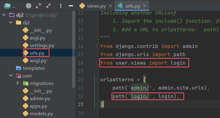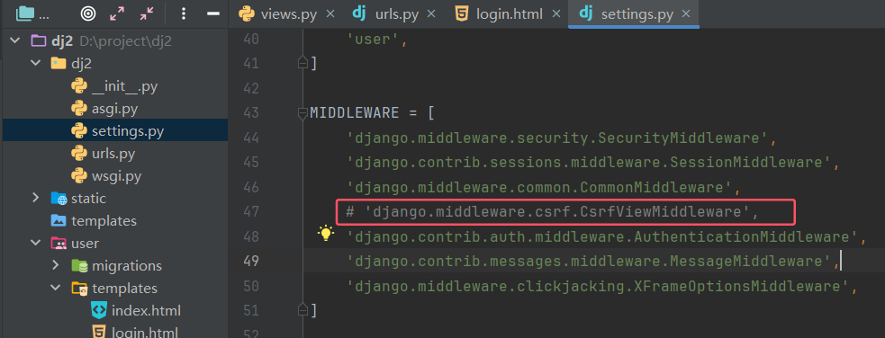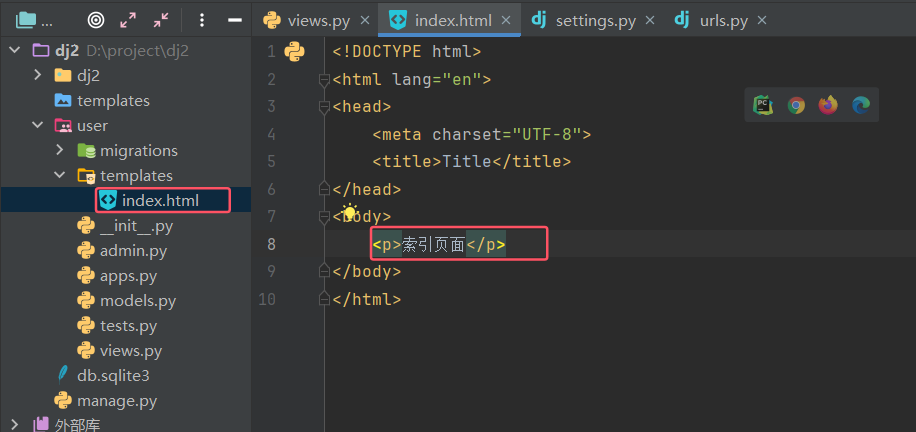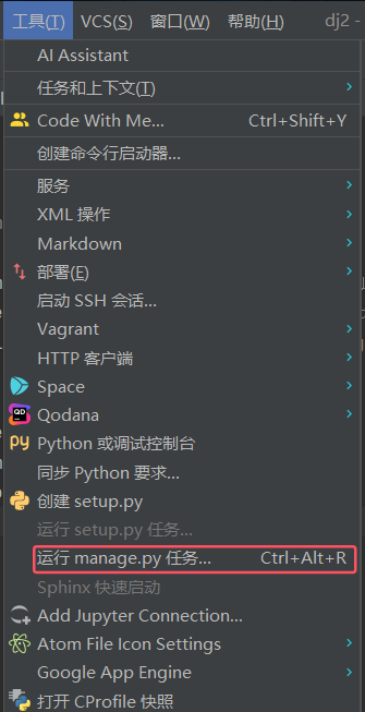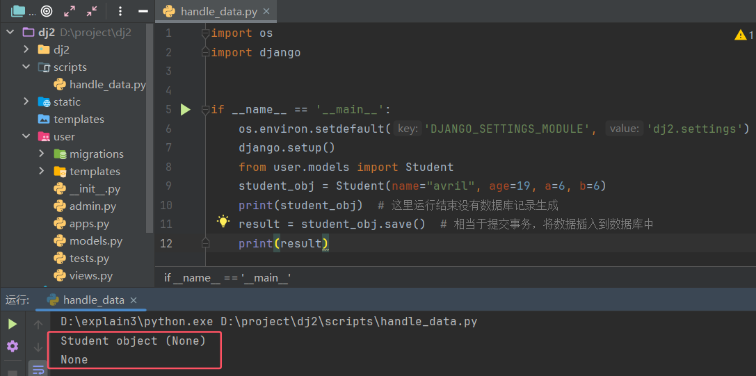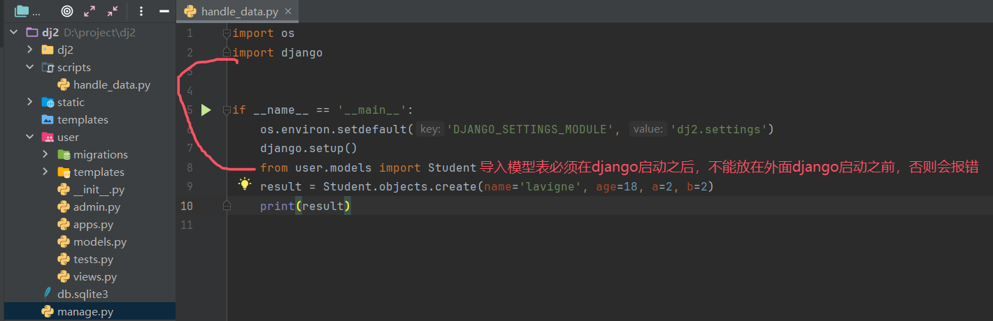 第二步:打开manage.py文件,复制main函数里第一行代码,项目名称不同则参数不同 os.environ.setdefault('DJANGO_SETTINGS_MODULE', 'dj2.settings')
