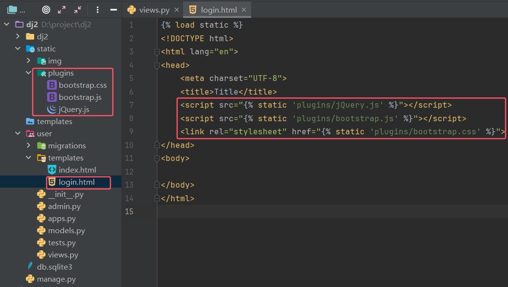 user应用的templates文件夹中创建login.html文件,引入bootstrap、jquery