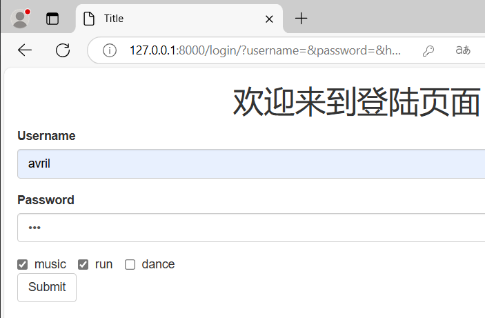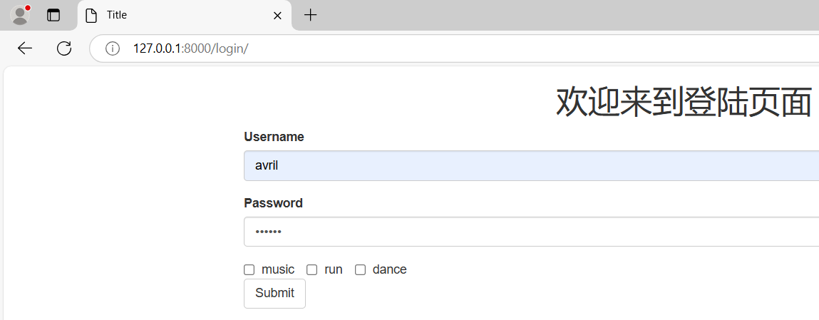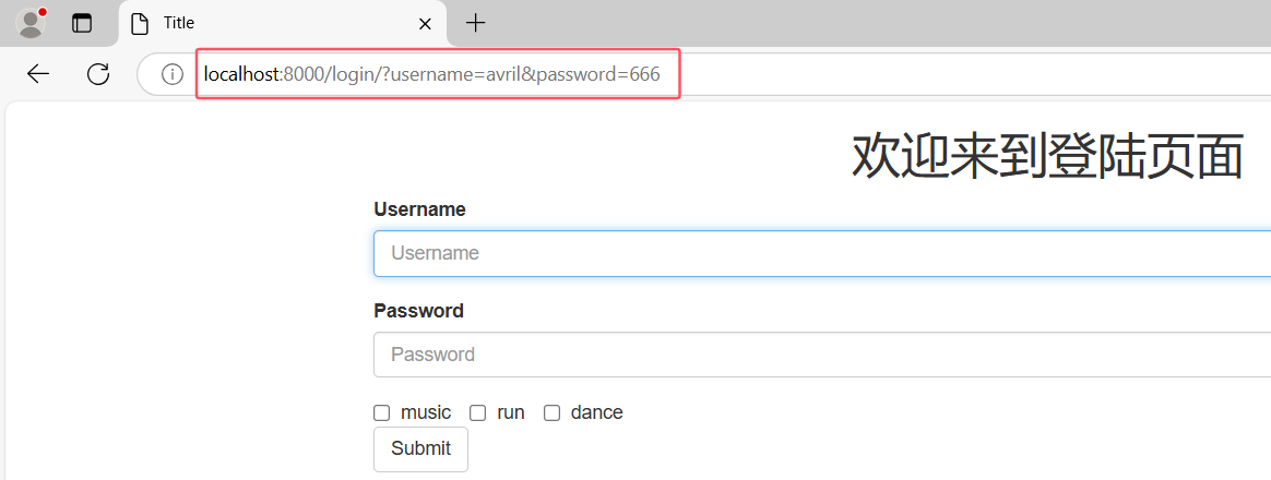 {% load static %} <!DOCTYPE html> <html lang="en"> <head> <meta charset="UTF-8"> <title>Title</title> <script src="{% static 'plugins/jQuery.js' %}"></script> <script src="{% static 'plugins/bootstrap.js' %}"></script> <link rel="stylesheet" href="{% static 'plugins/bootstrap.css' %}"> </head> <body> <div class="container-fluid"> <div class="row"> <div class="col-md-8 col-md-offset-2"> <h1 class="text-center">欢迎来到登陆页面</h1> {# action : 数据提交地址,不写默认提交到当前地址,写了则为指定地址 #} {# method : 请求方式,get、post #} <form action="" method="get"> <div class="form-group"> <label for="inputUsername">Username</label> <input type="text" class="form-control" id="inputUsername" name="username" placeholder="Username"> </div> <div class="form-group"> <label for="inputPassword">Password</label> <input type="password" class="form-control" id="inputPassword" name="password" placeholder="Password"> </div> <label class="checkbox-inline"> <input type="checkbox" id="inlineCheckbox1" name="hobby" value="music"> music </label> <label class="checkbox-inline"> <input type="checkbox" id="inlineCheckbox2" name="hobby" value="run"> run </label> <label class="checkbox-inline"> <input type="checkbox" id="inlineCheckbox3" name="hobby" value="dance"> dance </label> <br> <button type="submit" class="btn btn-default">Submit</button> </form> </div> </div> </div> </body> </html>