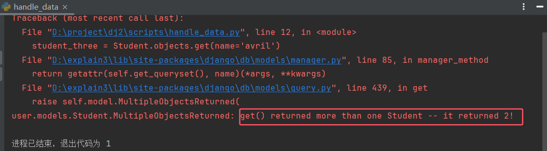 student_three = Student.objects.get(name='avril') # 多于1个也报错