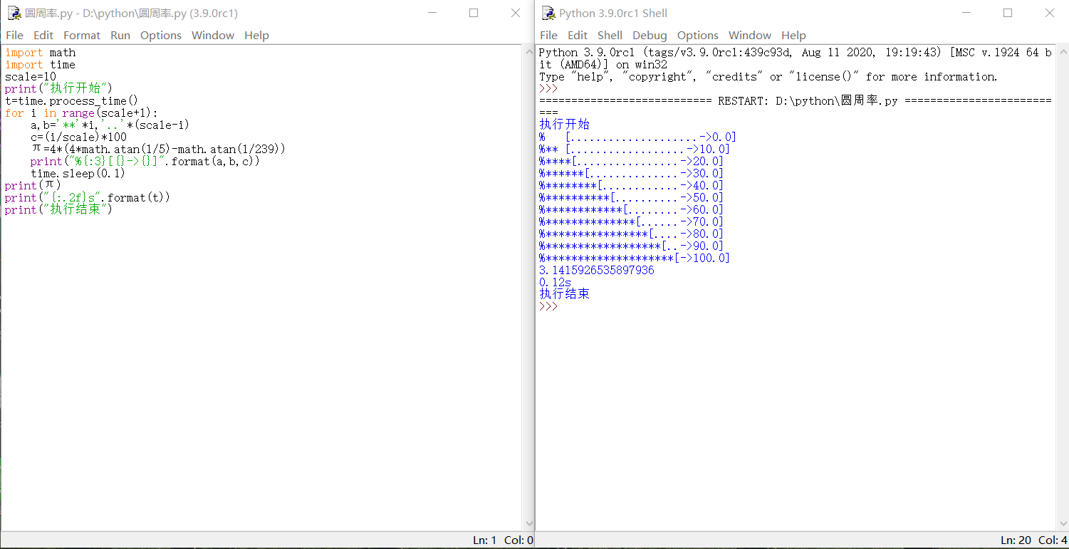 import math import time scale=10 print("执行开始") t=time.process_time() for i in range(scale+1): a,b='**'*i,'..'*(scale-i) c=(i/scale)*100 π=4*(4*math.atan(1/5)-math.atan(1/239)) print("%{:3}[{}->{}]".format(a,b,c)) time.sleep(0.1) print(π) print("{:.2f}s".format(t)) print("执行结束")