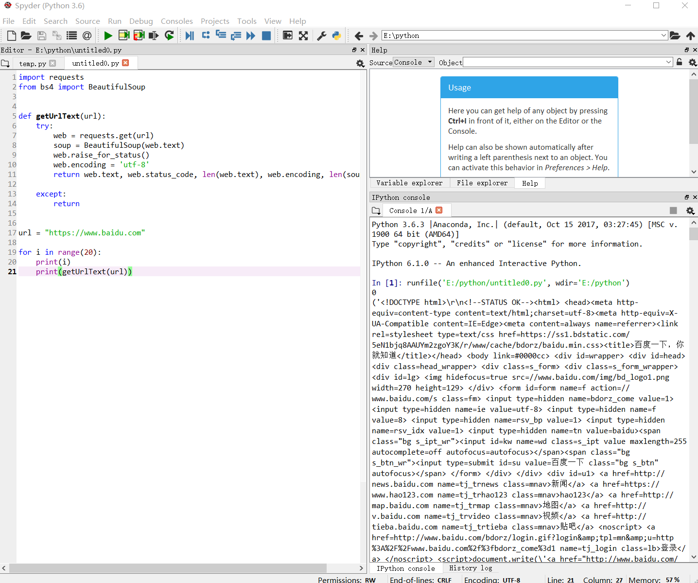 import requests from bs4 import BeautifulSoup def getUrlText(url): try: web = requests.get(url) soup = BeautifulSoup(web.text) web.raise_for_status() web.encoding = 'utf-8' return web.text, web.status_code, len(web.text), web.encoding, len(soup.text) except: return url = "https://www.baidu.com" for i in range(20): print(i) print(getUrlText(url))