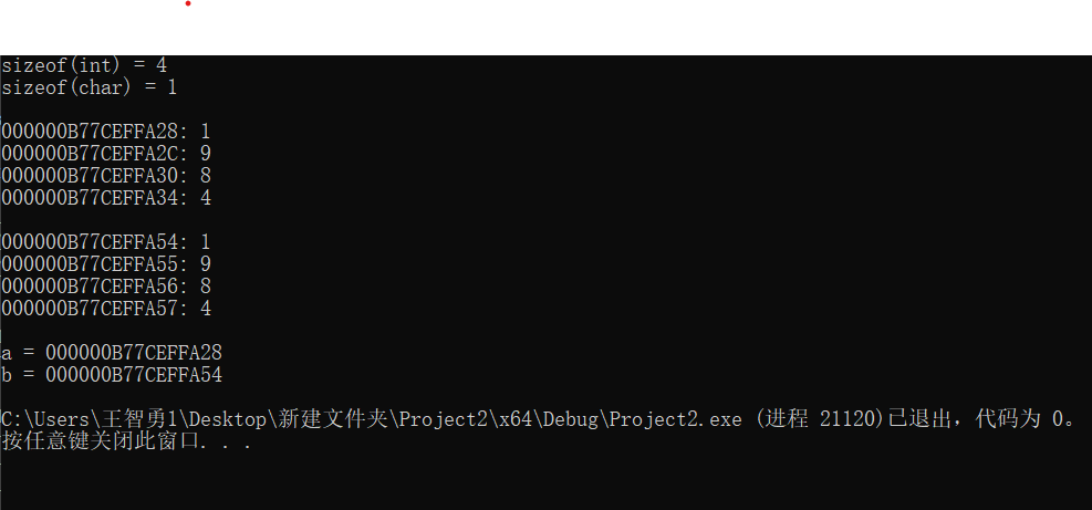 #include <stdio.h> #define N 4 int main() { int a[N] = { 1, 9, 8, 4 }; char b[N] = { '1', '9', '8', '4' }; int i; printf("sizeof(int) = %d\n", sizeof(int)); printf("sizeof(char) = %d\n", sizeof(char)); printf("\n"); for (i = 0; i < N; ++i) printf("%p: %d\n", &a[i], a[i]); printf("\n"); for (i = 0; i < N; ++i) printf("%p: %c\n", &b[i], b[i]); printf("\n"); printf("a = %p\n", a); printf("b = %p\n", b); return 0; }