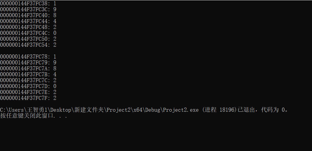 #include <stdio.h> #define N 2 #define M 4 int main() { int a[N][M] = { {1, 9, 8, 4}, {2, 0, 2, 2} }; char b[N][M] = { {'1', '9', '8', '4'}, {'2', '0', '2', '2'} }; int i, j; for (i = 0; i < N; ++i) for (j = 0; j < M; ++j) printf("%p: %d\n", &a[i][j], a[i][j]); printf("\n"); for (i = 0; i < N; ++i) for (j = 0; j < M; ++j) printf("%p: %c\n", &b[i][j], b[i][j]); return 0; }