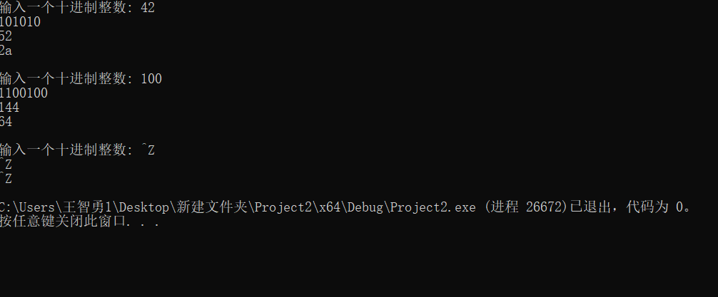 #include <stdio.h> #define N 100 void dec2n(int x, int n); int main() { int x; printf("输入一个十进制整数: "); while (scanf_s("%d", &x) != EOF) { dec2n(x, 2); dec2n(x, 8); dec2n(x, 16); printf("\n输入一个十进制整数: "); } return 0; } void dec2n(int x, int n) { char a[16] = { '0','1','2','3','4','5','6','7','8','9','a','b','c','d','e','f' }; int b[1000], i, count = 0, j; for (i = 0;; i++) { b[i] = x % n; x = x / n; if (x == 0) break; count++; } for (i = count ; i >=0 ; i--) { j = b[i]; printf("%c", a[j]); } printf("\n"); }
