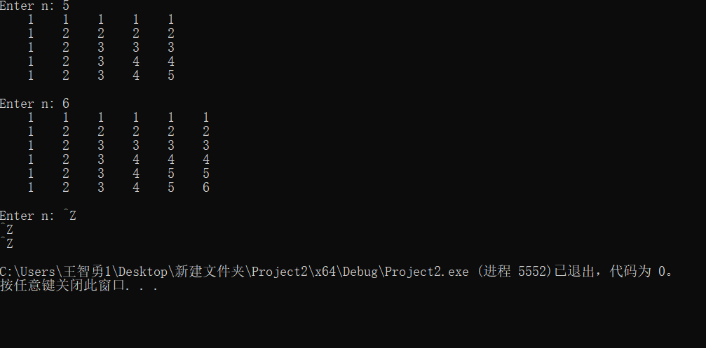 #include <stdio.h> #define N 100 void func(int x[][N], int n); void output(int x[][N], int n); int main() { int x[N][N]; int i, j, n; printf("Enter n: "); while (scanf_s("%d", &n) != EOF) { func(x, n); output(x, n); printf("\nEnter n: "); } return 0; } void output(int x[][N], int n) { int i, j; for (i = 0; i < n; ++i) { for (j = 0; j < n; ++j) printf("%5d", x[i][j]); printf("\n"); } } void func(int x[][N], int n) { int i, j; for (i = 0; i < n; ++i) { for (j = 0; j < n; ++j) { if (i > j) x[i][j] = j+1; else x[i][j] = i+1; } } }