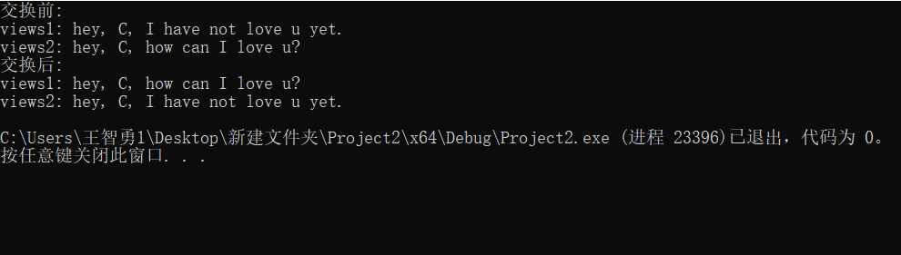 #include <stdio.h> #include <string.h> #define N 80 int main() { char views[2][N] = { "hey, C, I have not love u yet.", "hey, C, how can I love u?" }; char t[N]; printf("交换前: \n"); printf("views1: %s\n", views[0]); printf("views2: %s\n", views[1]); strcpy_s(t, views[0]); strcpy_s(views[0], views[1]); strcpy_s(views[1], t); printf("交换后: \n"); printf("views1: %s\n", views[0]); printf("views2: %s\n", views[1]); return 0; }