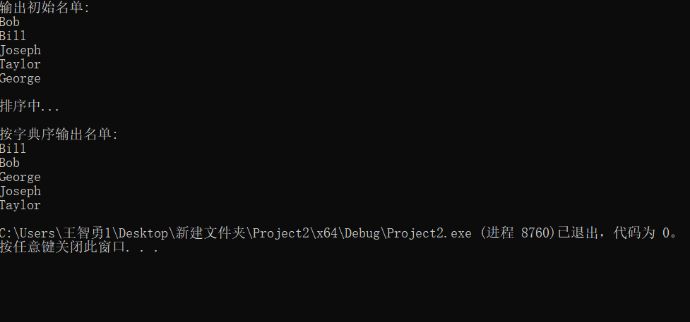 #include <stdio.h> #include <string.h> #define N 5 #define M 20 void bubble_sort(char str[][M], int n); int main() { char name[][M] = { "Bob", "Bill", "Joseph", "Taylor", "George" }; int i; printf("输出初始名单:\n"); for (i = 0; i < N; i++) printf("%s\n", name[i]); printf("\n排序中...\n"); bubble_sort(name, N); printf("\n按字典序输出名单:\n"); for (i = 0; i < N; i++) printf("%s\n", name[i]); return 0; } void bubble_sort(char str[][M], int n) { int i, j; char t[M]; for (i = 0; i < n; i++) { for (j = 0; j < n - 1 - i; j++) { if (strcmp(str[j], str[j + 1]) > 0) { strcpy_s(t, str[j]); strcpy_s(str[j], str[j + 1]); strcpy_s(str[j + 1], t); } } } }