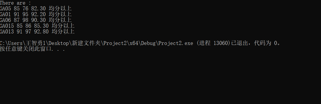 #include <stdio.h> #include<string.h> #define N 100 typedef struct { char num[10]; // 学号 int s1; // 期末成绩 int s2; // 平时成绩 double sum; // 总评 char level[10]; // 等级 } STU; int fun(STU a[], int n, STU h[]); // 函数声明 int main() { STU s[N] = { {"GA05", 85, 76}, {"GA03", 76, 90}, {"GA02", 69, 90}, {"GA04", 85, 56}, {"GA01", 91, 95}, {"GA07", 72, 80}, {"GA08", 64, 45}, {"GA06", 87, 98}, {"GA015", 85, 86}, {"GA013", 91, 97} }; // 原始学生成绩记录 STU h[N]; // 保存均分以上学生记录 int i, k, n = 10; // 调用fun对学生成绩记录进行处理 k = fun(s, n, h); // 输出均分以上学生记录 printf("There are :\n"); for (i = 0; i < k; i++) printf("%s %d %d %.2f %s\n", h[i].num, h[i].s1, h[i].s2, h[i].sum, h[i].level); return 0; } int fun(STU a[], int n, STU h[]) { int i, j = 0; double ave = 0; for (i = 0; i < n; i++) a[i].sum = a[i].s1 * 0.7 + a[i].s2 * 0.3; for (i = 0; i < n; i++) ave += a[i].sum; ave = ave / n; for (i = 0; i < n; i++) if (a[i].sum > ave) { strcpy_s(a[i].level, "均分以上"); h[j] = a[i]; j++; } return j; }