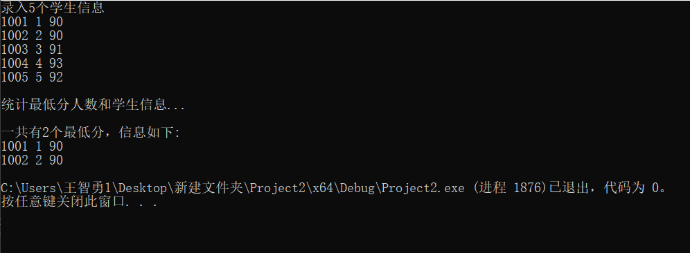 #include <stdio.h> #define N 5 // 定义结构体类型struct student, 并定义STU为其别名 typedef struct student { long no; char name[20]; int score; } STU; // 函数声明 void input(STU s[], int n); int find_min_list(STU s[], STU t[], int n); void output(STU s[], int n); int main() { STU stu[N], min_list[N]; int count; printf("录入%d个学生信息\n", N); input(stu, N); printf("\n统计最低分人数和学生信息...\n"); count = find_min_list(stu, min_list, N); printf("\n一共有%d个最低分,信息如下:\n", count); output(min_list, count); return 0; } // 输入n个学生信息,存放在结构体数组s中 void input(STU s[], int n) { int i; for (i = 0; i < n; i++) scanf_s("%d%s%d", &s[i].no, s[i].name, &s[i].score); } // 输出结构体s中n个元素信息 void output(STU s[], int n) { int i; for (i = 0; i < n; i++) printf("%d %s %d\n", s[i].no, s[i].name, s[i].score); } // 在结构体数组s中,查找最低分学生的记录,将其存入结构体数组t中 // 形参n是结构体数组s中元素个数 // 函数返回最低分的学生人数 int find_min_list(STU s[], STU t[], int n) { int j = 0, min = 100; for (int i = 0; i < N; i++) { if (s[i].score < min) min = s[i].score; } for (int i = 0; i < N; i++) { if (s[i].score == min) t[j++] = s[i]; } return j; }