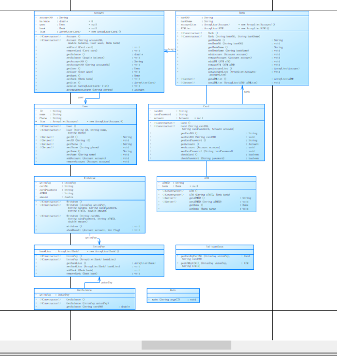 第九次作业增加了几个用户和一个银行,这个只要仔细就可以了。然后卡被分成了贷记卡和信用卡,信用卡可以透支,我最初在Card类里增加了信用卡,但是运行错误了,改了好多次,最终在Account类里直接增加一个参数,在输入数据的时候就直接标记能透支和不能透支的账户,终于可以了。最后这次ATM可以跨行,将原本不能跨行的判断代码注释即可。