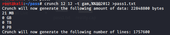 使用kali自带的crunch工具,根据提示构造好参数crunch 12 12 -t gam,%%@@2012