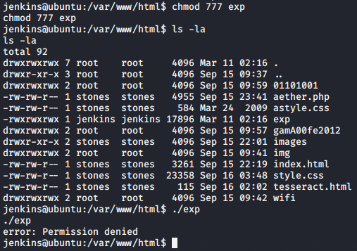 但是我将编译好的exp下载到靶机上后,试了好几个文件夹,也赋予了777权限,但是都没办法运行,只能尝试别的方法