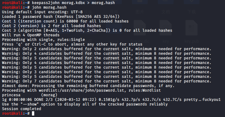 用keepass2john从密钥文件中提取哈希值,然后利用john破解哈希值得到密码:princesa