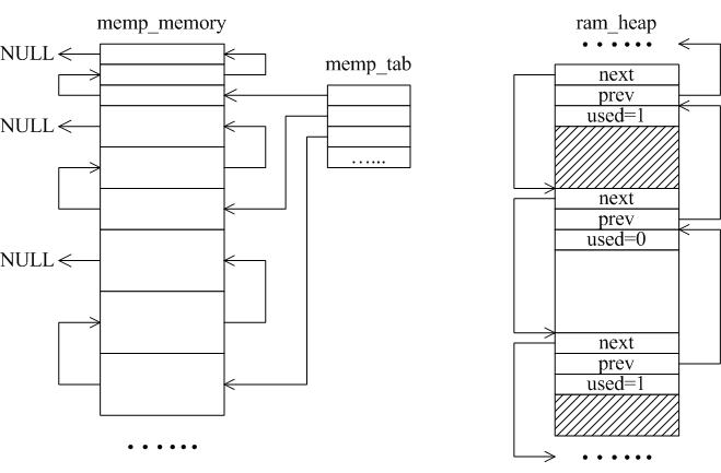 若定义MEMP_MEM_MALLOC=1,则memp.c中的全部内容不会被编译,用内存堆来实现内存池分配,使用这种方式得考虑是否能忍受内存堆分配带来的时间延迟。