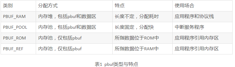 结构pbuf共有四种类型,它们的特点和使用场合如表1所示。